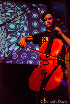 The band alternated between complex odd-time rhythms, straight ahead rock and trip hop. In dynamic polyrhythm, drums and cello played with and off of each other. The trio incorporated electronics and effects, each of Fiske’s vibraphone keys individually augmented with pickups. His vibes could at one instant be clean and organic sounding, the next dirty with deep low end feedback tonalities.